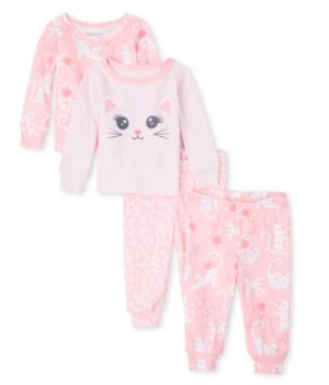 Girls Cute Cat Snug Fit Cotton 4-Piece Pajamas