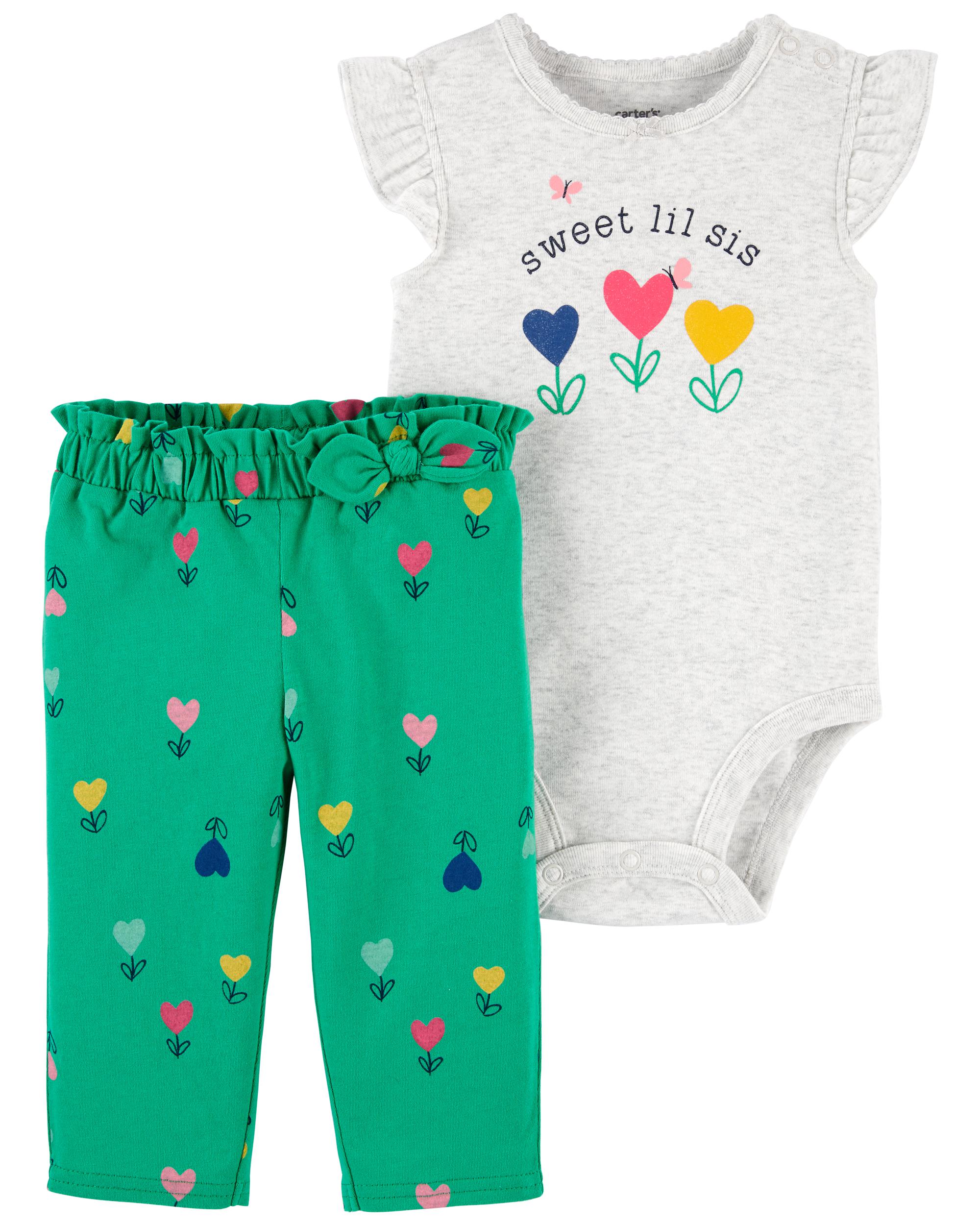 Made to match, this soft cotton set is complete with flutter-sleeve bodysuit and pull-on pants.