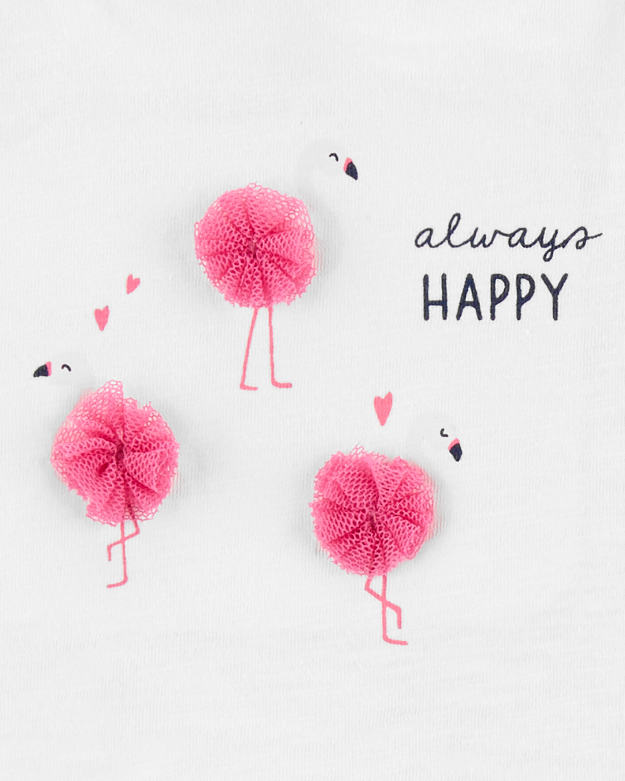 Screen-printed flamingos with 3D pom poms and “ALWAYS HAPPY” slogan