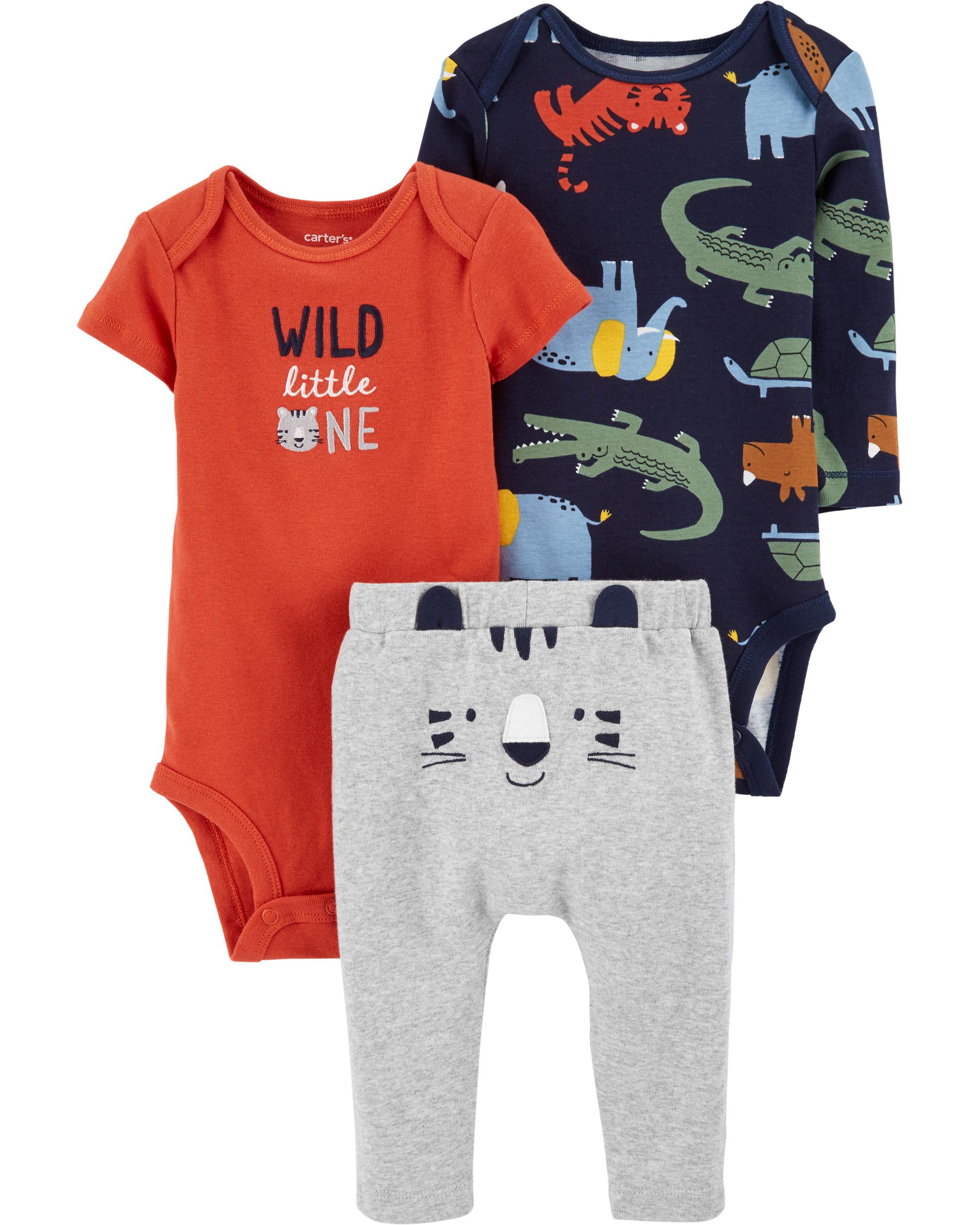 Featuring 3D ears and a tiger face on the bottom, plus two coordinating bodysuits, this silky-soft cotton set lets him mix and match with essential pants.