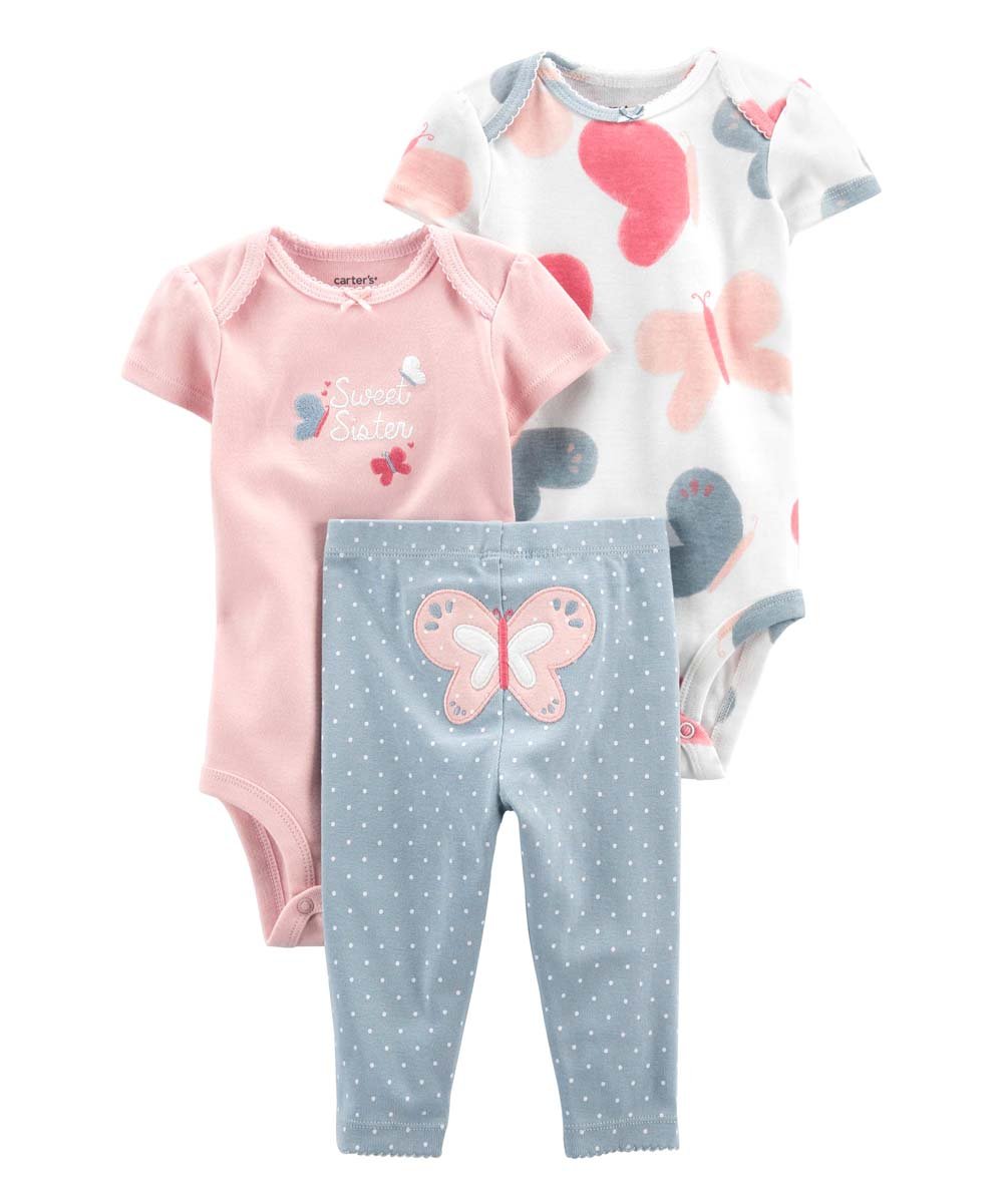 Stock up on three soft cotton pieces for baby including two short-sleeve bodysuits and a pair of pull-on pants.