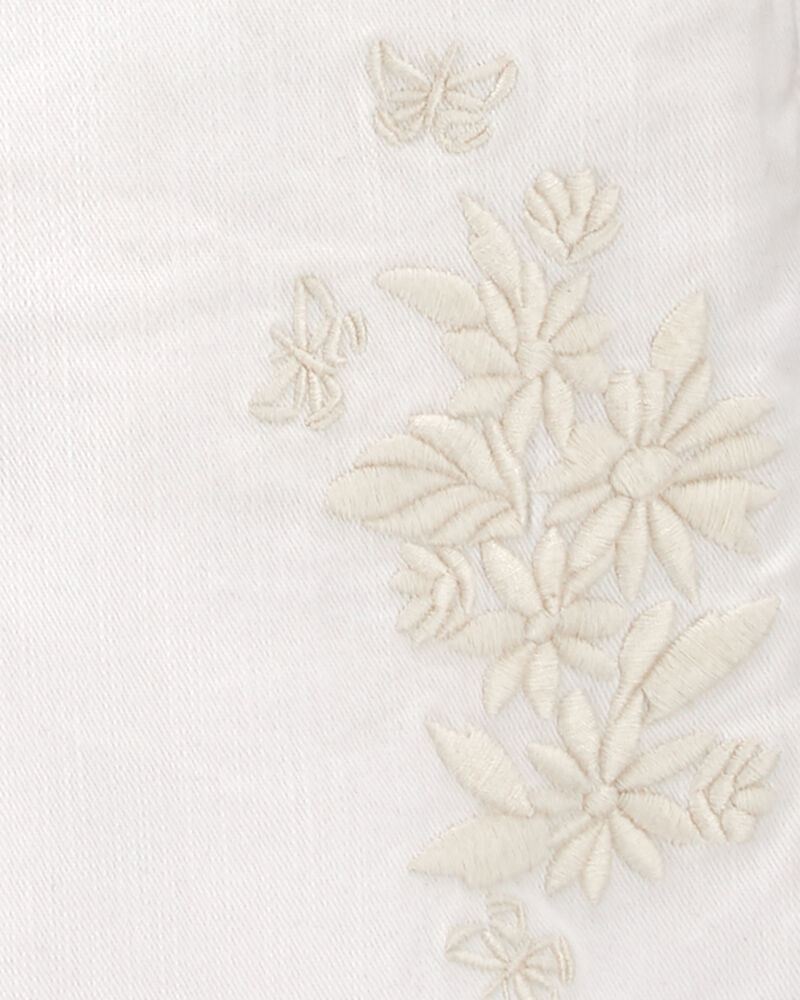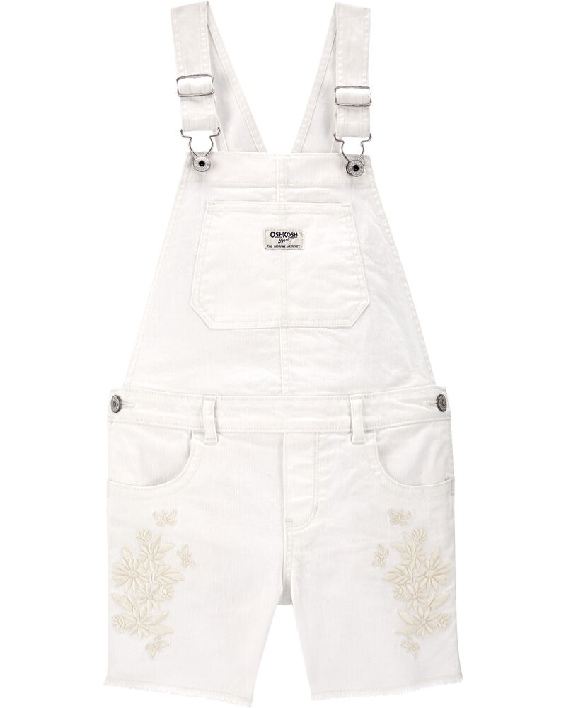Easy to match with any of her favourite tops, these comfy and stretchy shortalls feature fun details like a raw hem and embroidered floral design at the pockets!