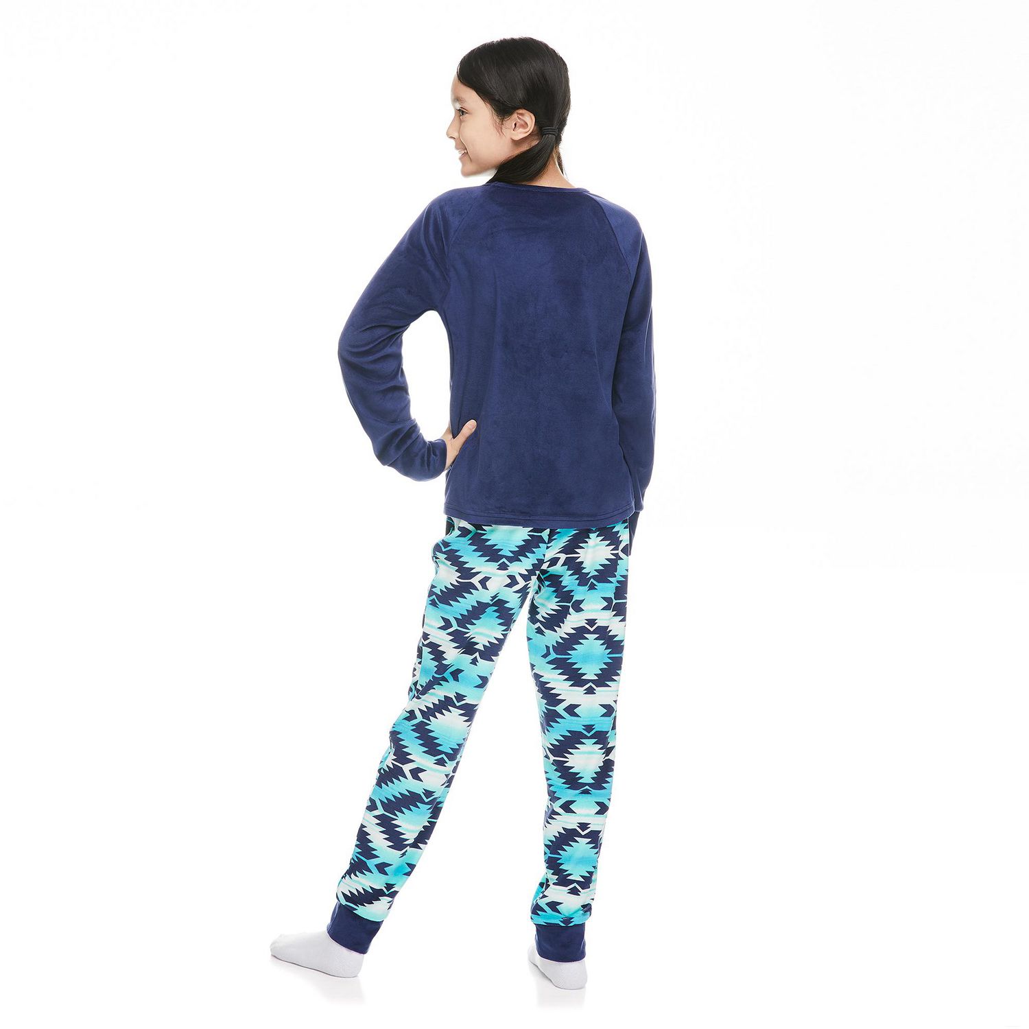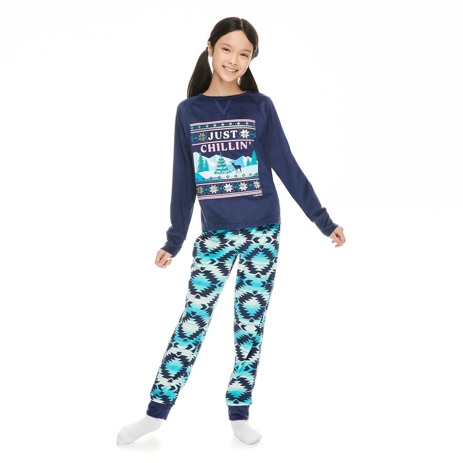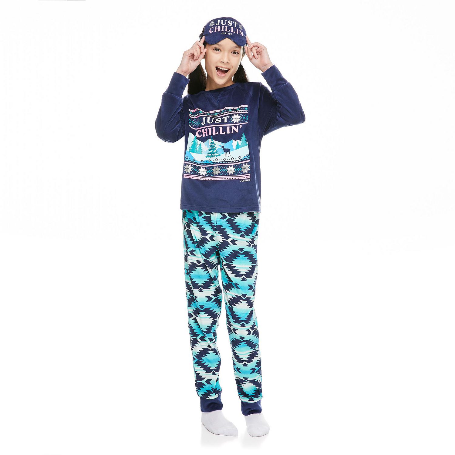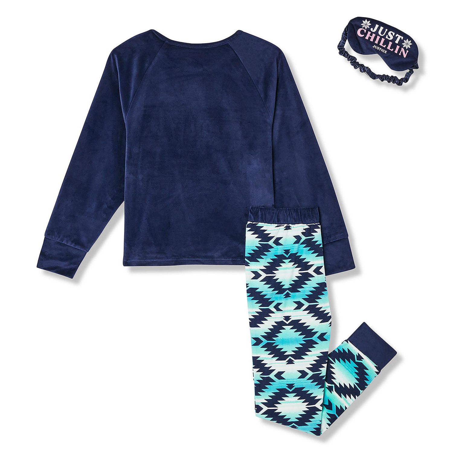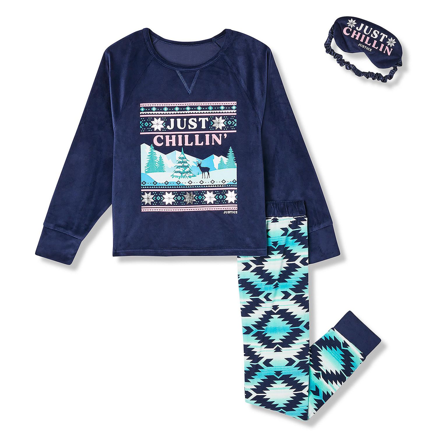 Get ready for bed with ease in these stylish Girls 3-piece Pajama sets from Justice! Included in the three piece set is a printed long sleeve top, a printed jogger pant, and a coordinating eye mask. The jogger pant has an elastic waistband for added comfort and a allover tie dye/aztec print. The long sleep top features bold graphic prints on the front of the top and raglan sleeve details.