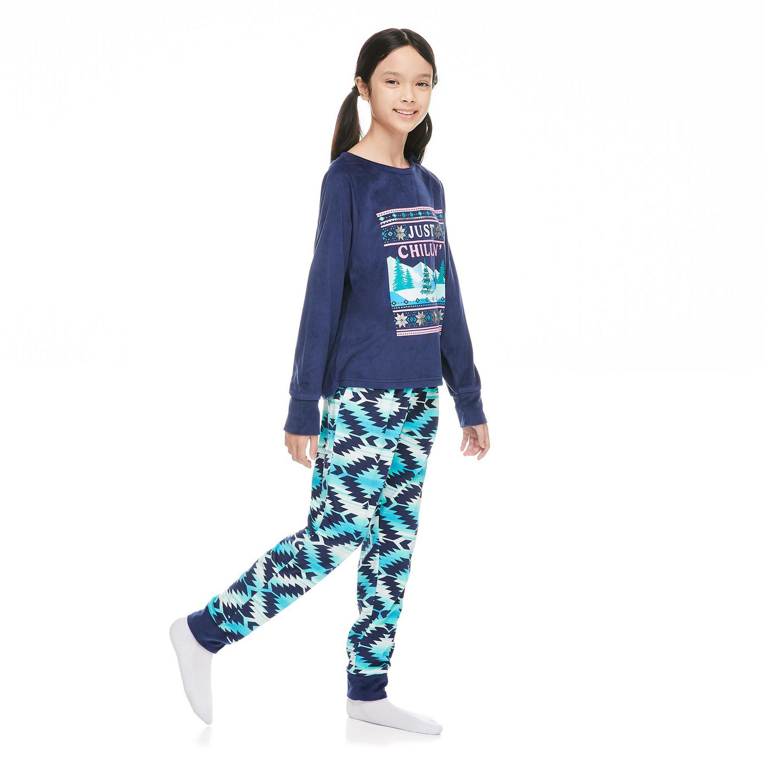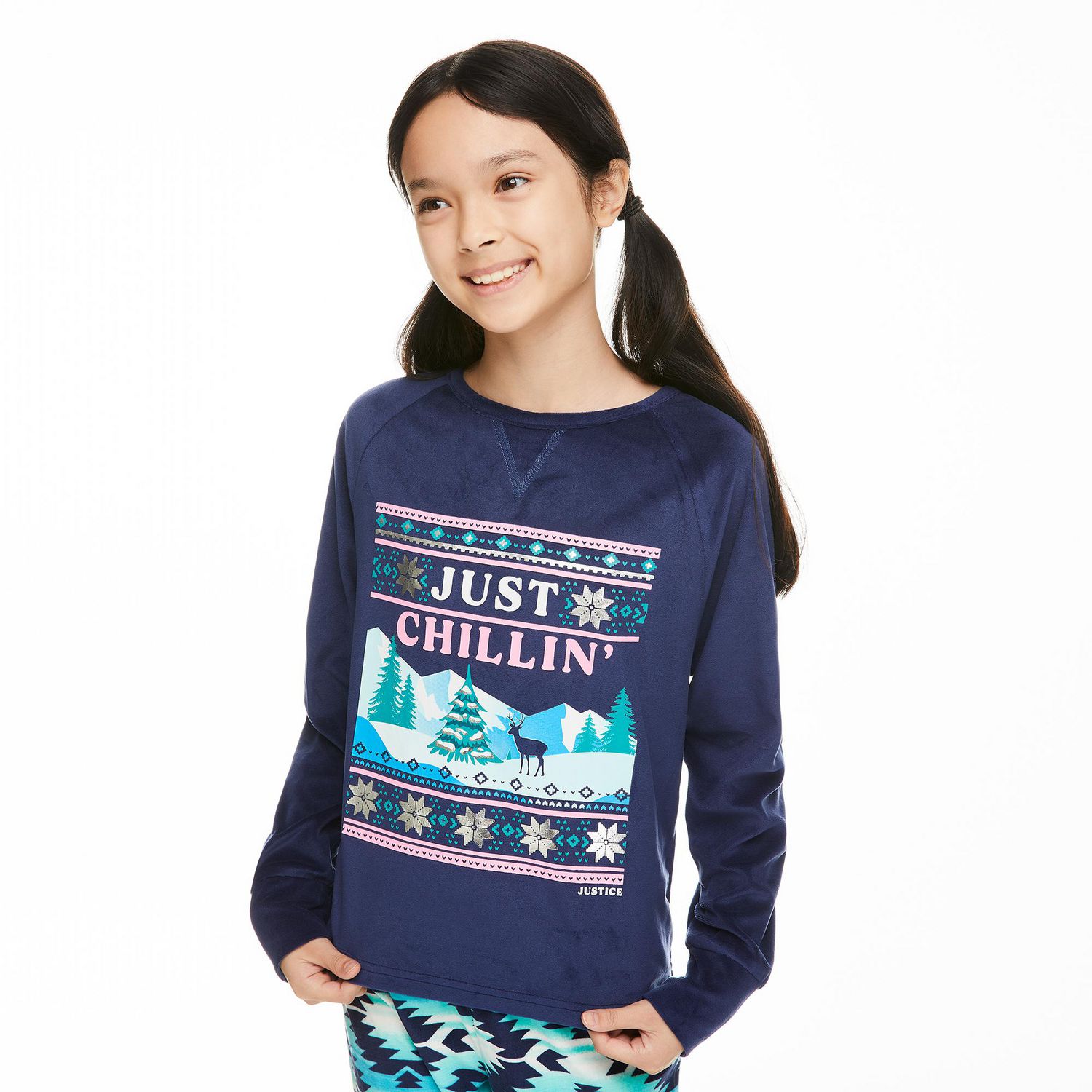 It might be cold outside, but she’ll be toasty warm thanks to Justice girls’ velour fleece pajamas and eye mask 3-piece set. Each piece is made with soft velour fleece to keep you cozy. The top is styled with a crew neckline, long raglan sleeves, and a front graphic print, while the pant features an elasticized waistband. The included comfy eye mask is key to a complete “lights out” experience.