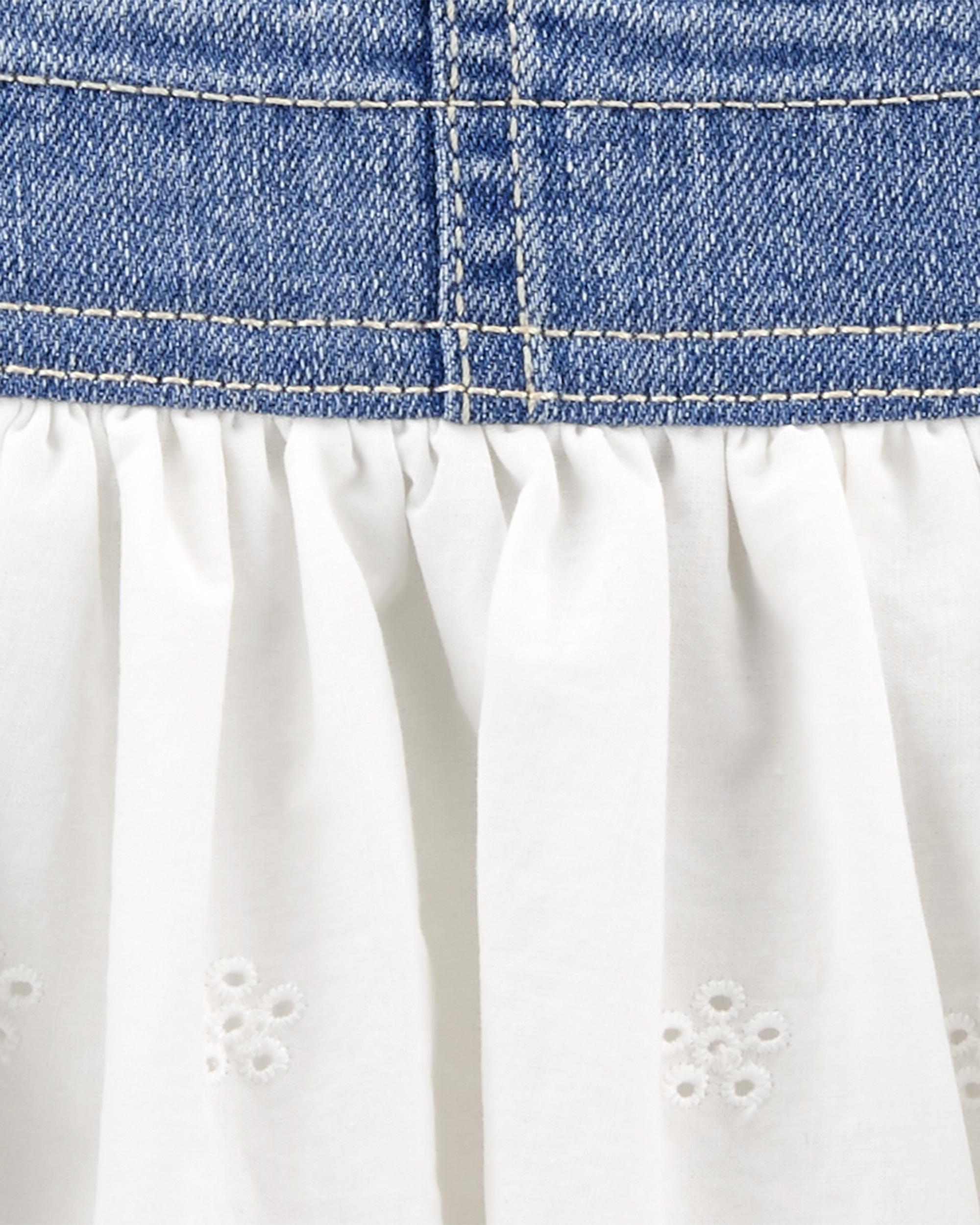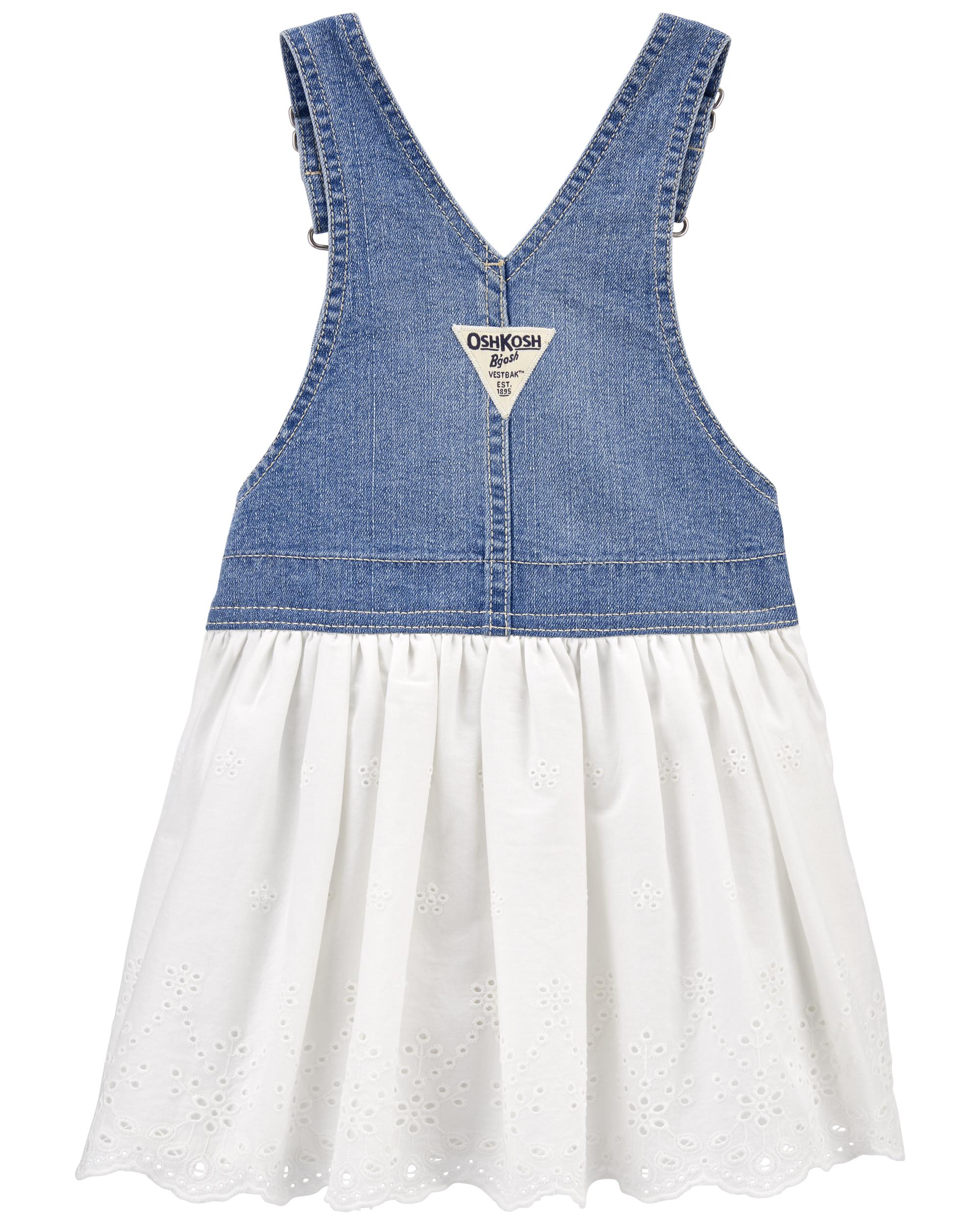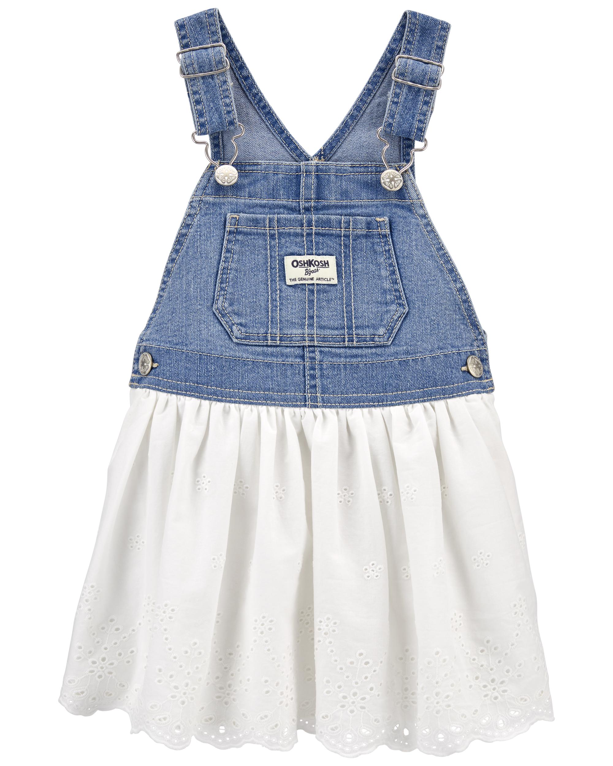 A soft, knit denim jumper in a cool blue wash with adjustable straps for a perfect fit and a pretty scalloped eyelet lace skirt for a twirl-worthy look she’ll love!