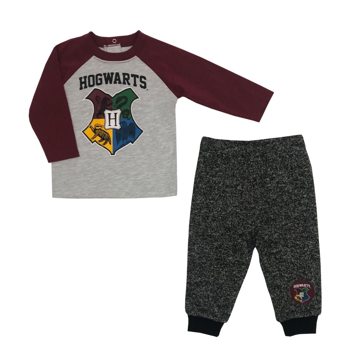 Warner Brothers Harry Potter 2pcs top and jogger pant set for boys. Raglan long sleeve top with rib neckline and screen print artwork at the front. Opening placket with 2 ring snaps at center back for easy dressing. Solid color jogger pant with woven patch appliqué at bottom of leg. Elastic waistband and rib leg cuff for easy dressing and comfort. Keep your little one warm and comfortable.